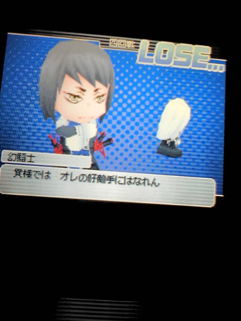 「めいり、か。いい名前だな」とか言ってきます。 完全にナンパですこのアルコバレーノ。 で、獄寺と山本は最初から仲間です。 獄寺はやんややんや言いつつ、山本はフレンドリーに。 そこから町を探索してヒロインコンビを仲間にします。 最初はこの4人+私でどうにかしてました。 プレイに慣れてきたころにリボーン先生が 抗争相手を見つけてきてくれます。 というわけで乗っ取り甲斐のある器かどうか 骸に試される抗争がスタートするわけであります。 最初は犬・千種・クロームの3人だけが相手ですが。 これ、また、決着発表画面が可愛いんですね。 勝った方が堂々と前にいて負けた方が 後でしょぼんぬ背中を向けているわけです。 こんな感じ。画像黒曜じゃないけど。 ちなみにスクアーロに頑張ってもらったけど 幻ちゃんに惜敗した時の画像です。 犬はハイブリッド相撲(土俵の上でボクシング・土俵から出た方が負け) 千種はクラッシュバイクレース(妨害しつつバイクで競争する) クロームは爆弾サバイバルクイズ(3回ミス&時間切れで爆弾拡大→爆発) 3人を倒すとようやく骸の入った フルメンバーと戦うことになります。 骸はドレッサーコンテスト(着替えて点数競う)でした。 ハルが一番センス高かったので頑張ってもらいましたが 結局一度も勝てませんでした。骸センス良すぎ。 何とか他種目で勝利しました。 犬と千種が去っていくのですが、クロームは残ります。 骸に宜しく頼まれて部下にすることに。 その後、黒曜をゲットして その辺うろついてる千種と犬を仲間にしました。 千種はあっさり仲間になってくれました。 骸がマフィアと馴れ合わないだの 君に用があろうと僕にはないだの何だの うるさかったんですが2人を仲間にした後は 「仲間になってほしいんですか?」とか言ってきます。 「はい」を選ぶとツンですが「いや別に」にすると 何か自分を見てもらえないのが気に入らなかったらしく 犬と千種は誘ったのに僕は~みたいなデレモードになって そのまま仲間になってくれました。何こいつ可愛い。 ちなみに現在千種は獄寺よりも新密度高いですMAXです。 獄寺あんまりうろついてないんだよね。 うろついてる子たちに話しかけるとその分 新密度が上がっていくシステムです。 ヴァリアー編に続く。 |